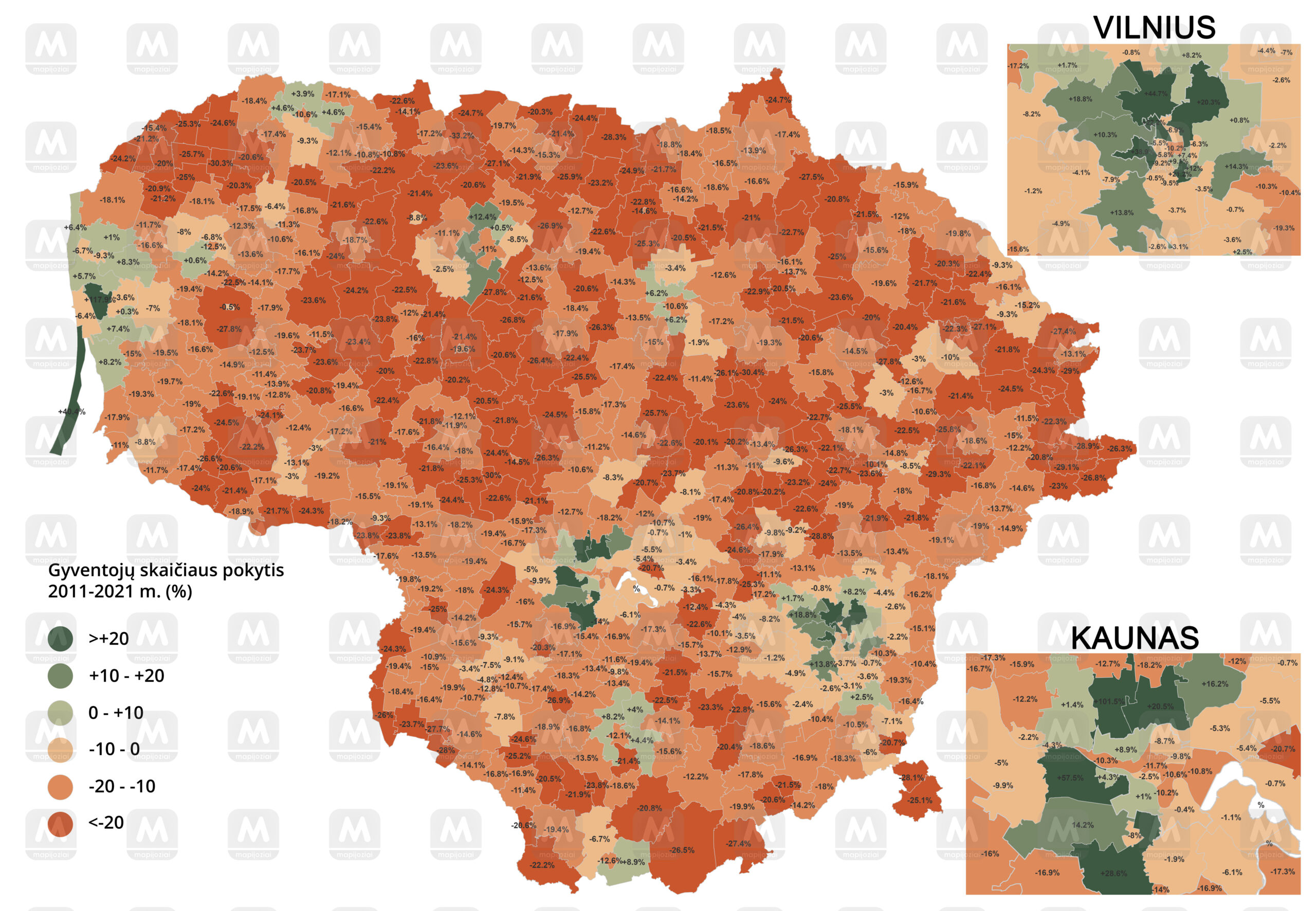 Gyventojų skaičius Lietuvos seniūnijose 2011-2021 m. (t.y., tarp dviejų visuotinių Lietuvos gyventojų surašymų 2011 ir 2021 m.) išlaikė panašias tendencijas kaip ir 2001-2011 m. dešimtmetyje. Gyventojų skaičius augo aplinkui didžiuosius miestus esančiose seniūnijose, tik per pastarąjį dešimtmetį nemaža dalis ir Vilniaus miesto seniūnijų taip pat ėmė augti. Kitaip tariant, Lietuvoje ir toliau vyksta nevaldoma suburbanizacija.